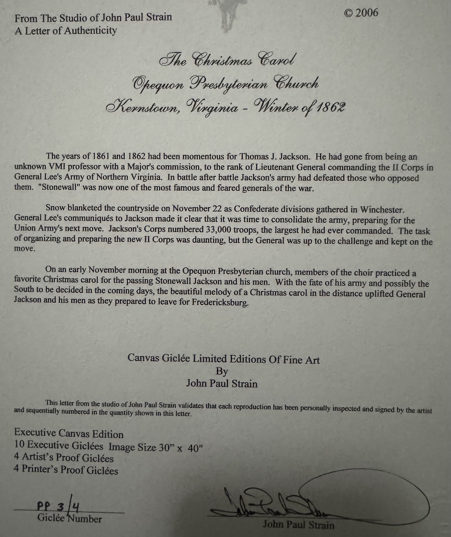 On an early November morning at the Opequon Presbyterian church, members of the choir practiced a favorite Christmas carol for the passing Stonewall Jackson and his men. With the fate of his army and possibly the South to be decided in the coming days, the beautiful melody of a Christmas carol in the distance uplifted General Jackson and his men as they prepared to leave for Fredericksburg.
